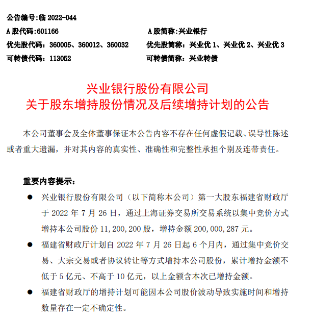 7月26日晚,興業銀行發佈關於股東增持股份情況及後續增持計劃的公告,稱公司第一大股東福建省財政廳於7月26日,通過上海證券交易所交易系統以集中競價方式增持公司股份1120.02萬股,增持金額超2億元。