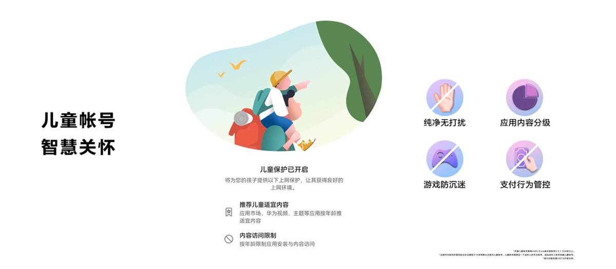 另外,華為還為14歲以下兒童打造了華為兒童賬號。以華為兒童賬號登錄時,廣告跟蹤和相關應用的營銷類活動將會關閉,支付等敏感操作需要獲得家長授權,華為瀏覽器等原生應用也將自動對內容進行篩選,並支持家長自由設定準許上網時長,主動對孩子進行上網保護。