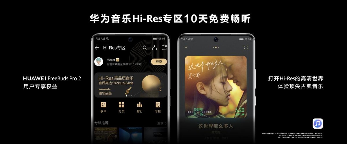 此次華為音樂推出全新空間音頻體驗專區,用户能聽到眾多熱門歌曲的空間音頻版本,包括蔡健雅、陳立農、陳梓童、吉娜、毛不易、SUNNEE楊芸晴、許巍等知名音樂人,為好作品提供一個全新的打開方式。購買HUAWEI FreeBuds Pro 2的新機用户,將附贈價值100元華為音樂新用户禮包,以及華為音樂Hi-Res專區10天免費暢聽權益(全國共計40萬份,先到先得)。用户不僅能暢聽千萬正版曲庫,還能聆聽Hi-Res高解析度音樂,享受高品質音樂體驗。
