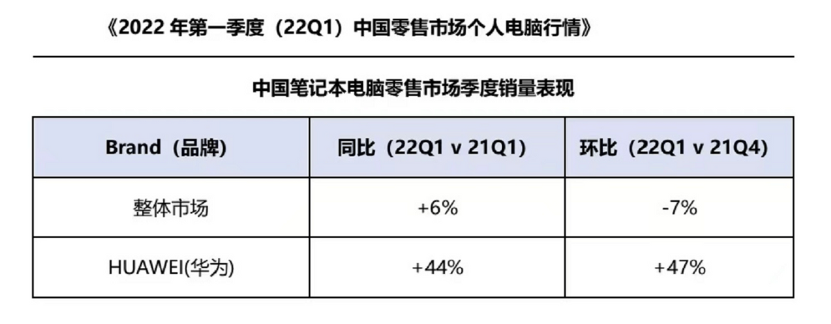 【環球網報道 記者 張陽】2022年6月,捷孚凱(GFK)市場諮詢(中國)有限公司發佈了《2022年第一季度(22Q1)中國零售市場個人電腦行情》數據報告。其中,筆記本電腦零售市場報告內容顯示,2022年Q1中國筆記本電腦零售市場季度銷量同比增長6%,環比下降7%。與此同時,華為筆記本電腦零售市場銷量同比增長44%,環比增長47%;此外,在輕薄本電腦零售市場,華為在2022年Q1份額季度環比增長率為59%,達到18.6%,並在5K+價位段份額增長至28.7%。與整體表現交相輝映的是,在輕薄本線下渠道中,華為Q1份額季度環比增長率為37%,達到26.2%,整體實現了大幅度逆勢增長。