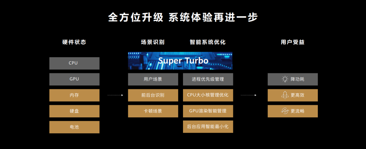 性能上,全系換裝第十二代英特爾酷睿處理器倒不足為奇。不過,其首次發佈Super Turbo技術就不得不讓人大感好奇了,在發佈會上華為表示這一技術能夠突破硬件性能限制。電腦運行出現卡頓主要是後台閒置程序佔用太多性能資源所致,而Super Turbo技術源於華為多年來持續對筆記本電腦進行系統底層的優化,能夠更好的發揮CPU和GPU性能的同時降低功耗。華為自研的Super Turbo應用運行智能加速功能,讓電腦更懂用户使用場景性能所需,智能調度前後台應用使用資源,提升前台應用流暢度。在電腦有限的性能賽道上清空卡頓阻礙,讓筆記本開啓“快車道”。