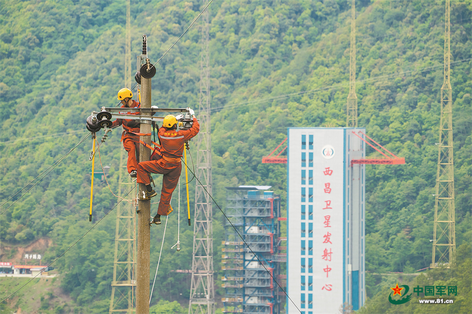 西昌衞星發射中心功勳塔架,天鏈系列衞星均從這裏發射升空。圖為勤務保障系統操作手對供電線路進行檢修。胡增輝 攝
