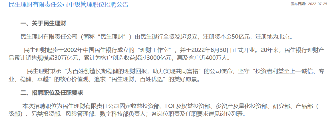 6月30日,民生理財已正式開業。不過,公司部分部門中層仍在招聘中。7月25日,民生銀行網站發佈了民生理財中級管理職位招聘公告,招聘固定收益投資部、FOF及權益投資部、多資產及量化投資部、研究部、產品部(二級部)、另類投資部、風險管理部、數字科技部負責人。