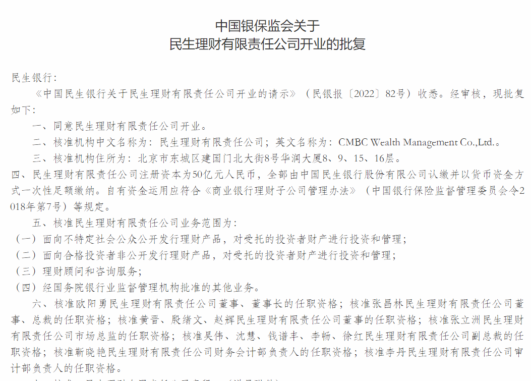 民生理財開業批覆文件顯示,公司註冊資本為50億元,全部由中國民生銀行股份有限公司認繳並以貨幣資金方式一次性足額繳納。銀保監會核准民生理財業務範圍包括面向不特定社會公眾公開發行理財產品,對受託的投資者財產進行投資和管理;面向合格投資者非公開發行理財產品,對受託的投資者財產進行投資和管理;理財顧問和諮詢服務;經國務院銀行業監督管理機構批准的其他業務。