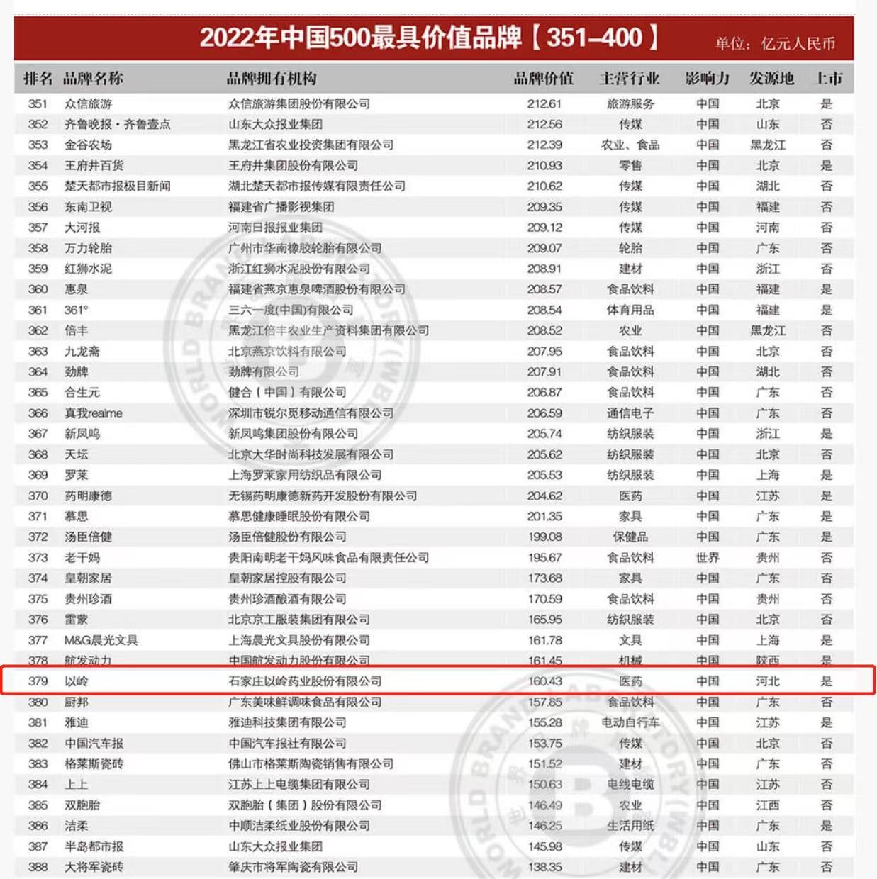 以嶺藥業再次榮登“中國500最具價值品牌榜”