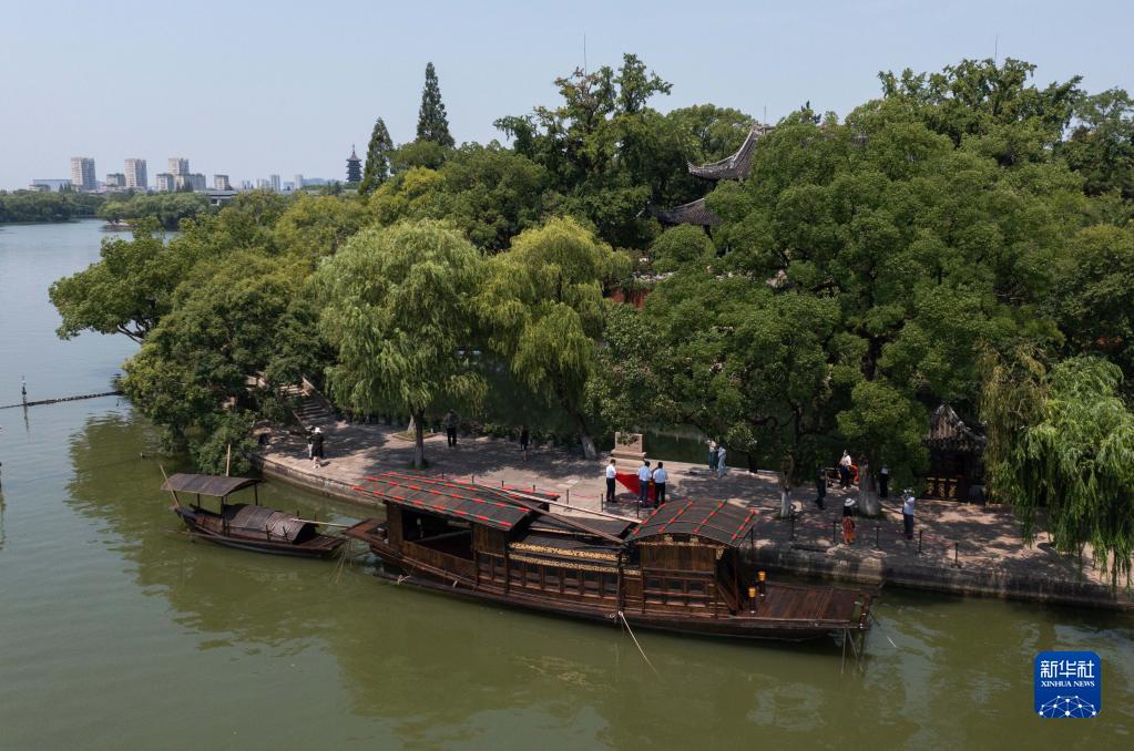南湖紅船停靠在嘉興市南湖旅遊區的湖心島旁(7月27日攝,無人機照片)。