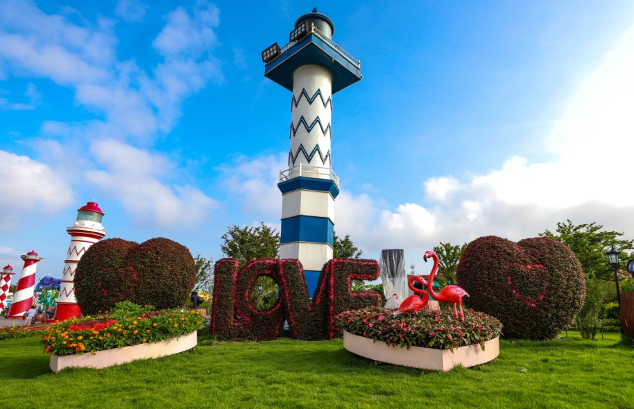 位於星光大道西側,以簡約、浪漫為主題,藍色燈塔為背景,同色系時令花卉為基底,搭配愛心、LOVE等花雕造型,吸引年輕情侶為愛情打卡。