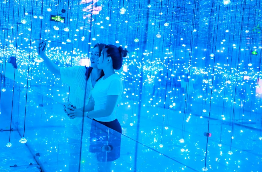 穿越光影斑駁的海洋通道,一個接一個的夢幻場景徐徐展開。在充滿青島海洋特色的全景海洋主題館,市民遊客彷彿置身海洋世界,忍不住與栩栩如生的海洋生物互動起來。走進“鏡子迷宮”裏,大家會和無數個自己相遇,只有靜下心來,才能逃離無限循環的鏡子世界;走入銀河之心體驗館,搖曳多姿的花藤串聯起明暗變幻、色彩斑斕的水晶燈,在室內打造出一個如夢似幻的空間,燈光在那片小天地中交相輝映,彷彿置身在浩瀚無垠的宇宙星空。