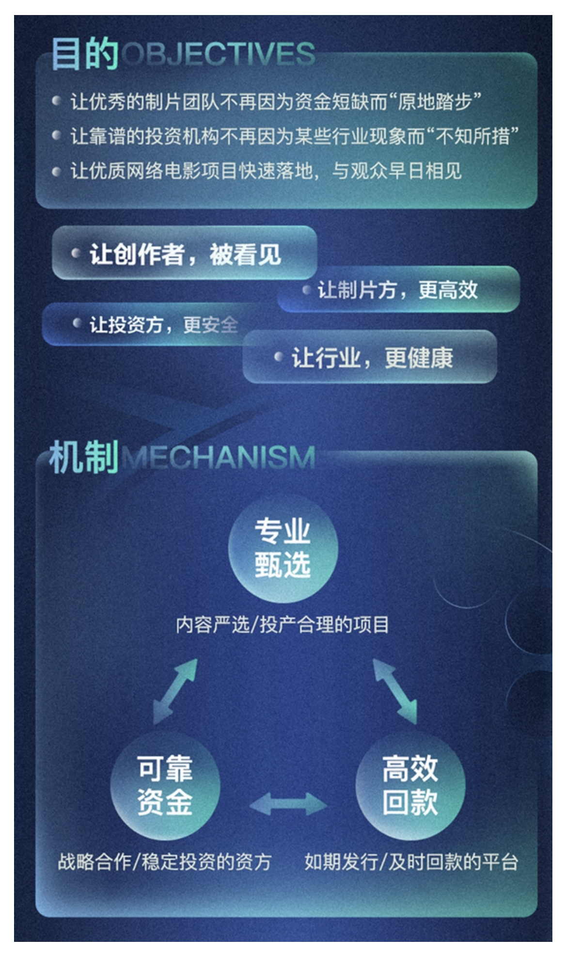 愛奇藝副總裁、電影中心總經理宋佳表示:“通過這幾個月與產業各方的接觸,發現大家都很有熱情,我們對大家的需求和難處也有了更深入的瞭解。我們會為一些有資金需求的好項目嫁接資金,幫助項目做得更好。同時,很多資方也認為這在一定程度上降低了他們的資金風險,他們自己直接去市場上找項目的話,可能風險性比較高。”