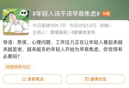 抗衰和延緩衰老成為社會關注的熱門話題,#年輕人該不該早衰焦慮#話題登上微博熱搜榜。話題下的討論也體現了當代年輕人對衰老的焦慮,以及想要抗衰的迫切心情。