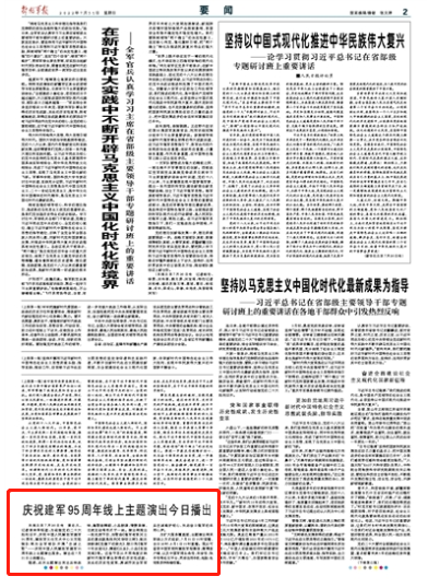 解放軍報北京7月30日電 黃志凡、記者袁麗萍報道:為迎接黨的二十大勝利召開,慶祝中國人民解放軍建軍95週年,解放軍文化藝術中心文藝輕騎隊將為全軍部隊開展“忠誠之歌”——慶祝中國人民解放軍建軍95週年線上主題演出服務。演出在7月31日上線播出。