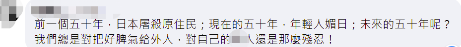 有網友表示,前一個五十年,日本屠殺島內少數民族;現在的五十年,年輕人媚日;未來的五十年呢?“我們總是對把好脾氣給外人,對自己的民眾那麼殘忍!”↓