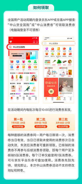 全國用户活動週期內登錄京東APP或京喜APP搜索“中山貨全國購”或“中山消費券”可領取消費券(電腦端登錄不可領券)。