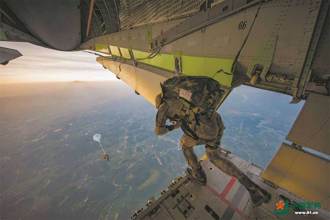 伴着嘹亮的口號聲,特戰隊員有序穿戴傘具、披掛武器裝備,隨後按照作戰編組快速登機。不多時,數架運輸機呼嘯升空,直插雲霄。抵達預定空域後,艙門緩緩打開,特戰隊員手握拉繩、含胸、屈膝,做好傘降準備。“跳!”投放員下達命令,特戰隊員快速躍出機艙。轉瞬之間,數千米高空綻放出朵朵傘花。