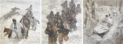 移防部署、衞國戍邊,全軍將士聽黨指揮的忠誠品格在美術工作者筆下熠熠生輝。王朝相、楊冰莉、程建利合作的油畫《北疆衞士》,以三聯畫的形式,描繪了寒冬臘月祖國邊疆的衞士們,以不同方式巡邏的場景。畫家藉助環境的真實描繪和人物形象的生動刻畫,凸顯我軍官兵視祖國利益高於一切的責任擔當和堅強意志。楊斌油畫《青春灑在邊防線》、何永興油畫《崑崙赤子》等作品,則通過肖像式的描繪和細膩的神態刻畫,再現了戍邊軍人的艱辛與堅強。