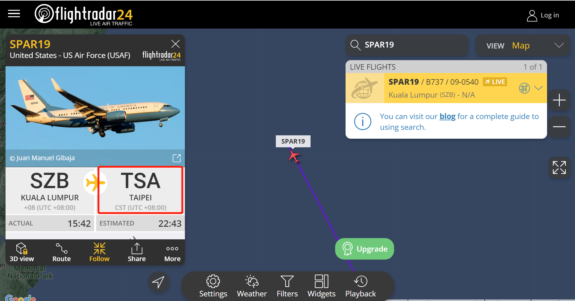 根據飛行航班信息平台FlightRadar24顯示,據信是美國眾議院議長佩洛西搭乘的C-40C專機(呼號SPAR19)於北京時間8月2日15時42分從吉隆坡的機場起飛,21時25分左右該平台顯示出此架飛機目的地:台北,預計到達時間22時43分。
