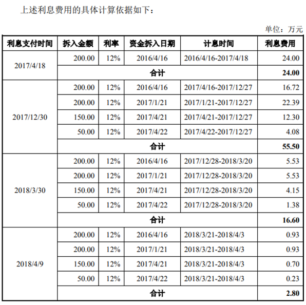 但從恆工精密披露的利息費用計算表看,公司多筆資金拆入計息時間是從拆入後一年,甚至更久後才開始算,如2016年4月16日拆入200萬元,但從2017年12月28日才開始計息。恆工精密並未説明其中原因。