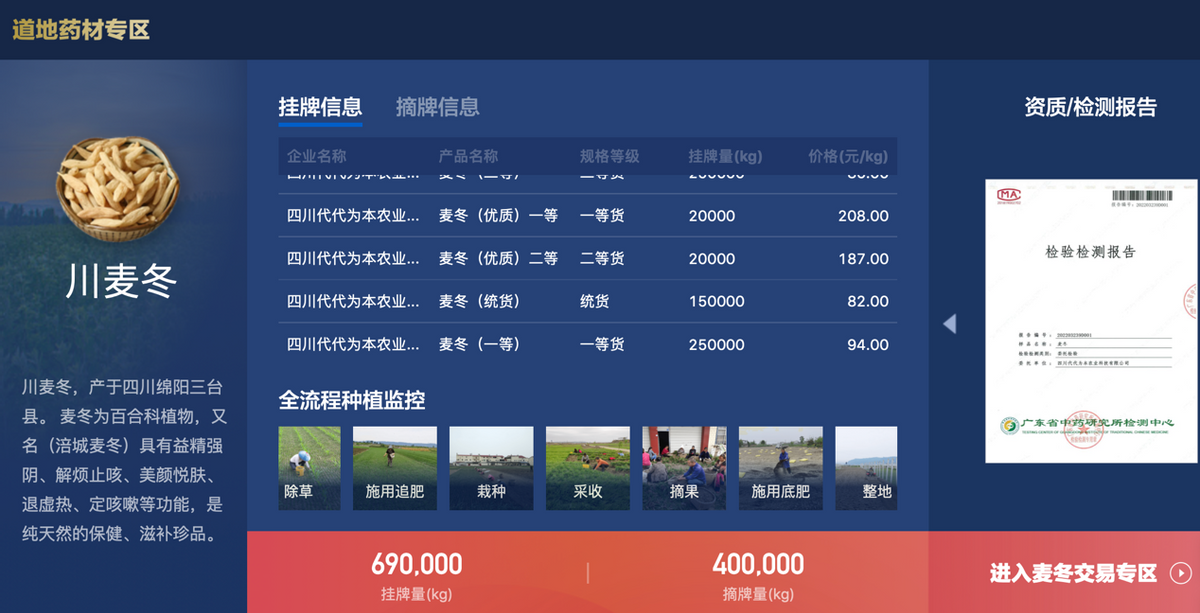 以麥冬為例,山東互聯網中藥(材)交易中心和代代為本合作,建設了川麥冬產地倉。產地倉遵循《中藥材商品規格等級標準》,利用土壤改良等30多項專利技術,按照統一品種、統一技術等進行規範化、標準化生態種植,從而提升川麥冬品質。