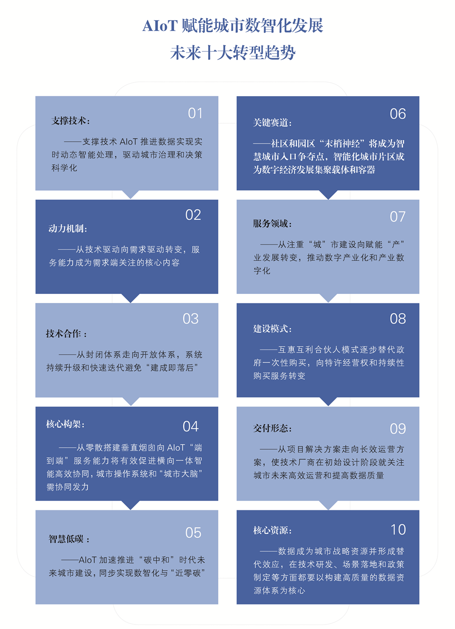 值得一提的是,《白皮書》還分享了當前AIoT技術賦能城市數智化發展所呈現出的十大未來趨勢。趨勢一:在支撐技術層面,呈現出AIoT推進數據實現即時動態智能處理,驅動城市治理和決策科學化的趨勢;趨勢二:在動力機制層面,從技術驅動向需求驅動轉變,服務能力正成為需求端關注的核心內容;趨勢三:在技術合作層面,技術正在從封閉體系走向開放體系,系統持續升級和快速迭代避免了“建成即落後”現象;趨勢四:在核心架構層面,AIoT“端到端”服務能力將有效促進橫向一體智能的高效協同,城市操作系統和“城市大腦”需協同發力;趨勢五:在雙碳目標的推進層面,AIoT技術正在加速推進“碳中和”時代未來城市的建設,數智化與“近零碳”將同步實現;趨勢六:在關鍵賽道層面,社區和園區“末梢神經”將成為智慧城市入口爭奪點,智能化城市片區成為數字經濟發展集聚載體和容器;趨勢七:在服務領域層面,AIoT技術正在從注重“城”市建設向賦能“產”業發展轉變,推動數字產業化和產業數字化;趨勢八:在建設模式層面,互惠互利合夥人模式正逐步替代政府一次性購買,向特許經營權和持續性購買服務轉變;趨勢九:交付形式上,單點項目解決方案亦在走向暢銷運營方案,使技術廠商在初始設計階段就關注城市未來高效運營和提高數據質量;趨勢十:在核心資源層面,數據正在成為城市戰略資源並形成替代效應,在技術研發、場景落地和政策制定等方面,都要以構建高質量的數據資源體系為核心。