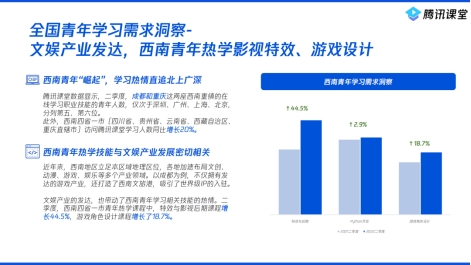 西南青年依託當地發達的文娛產業,積極學習設計類課程,其中特效與影視後期課程學習人數增長44.5%,遊戲角色設計課程學習人數增長了18.7%。