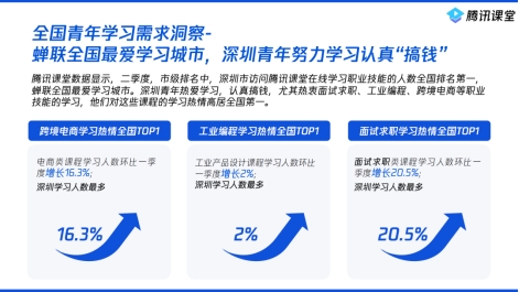 二季度,深圳依然蟬聯全國最愛學習城市。在市級排名中,深圳市在線學習職業技能人數全國排名第一。努力學習認真“搞錢”的深圳青年,學習“面試求職”、“工業編程”、“跨境電商”相關課程的熱情高居全國第一。