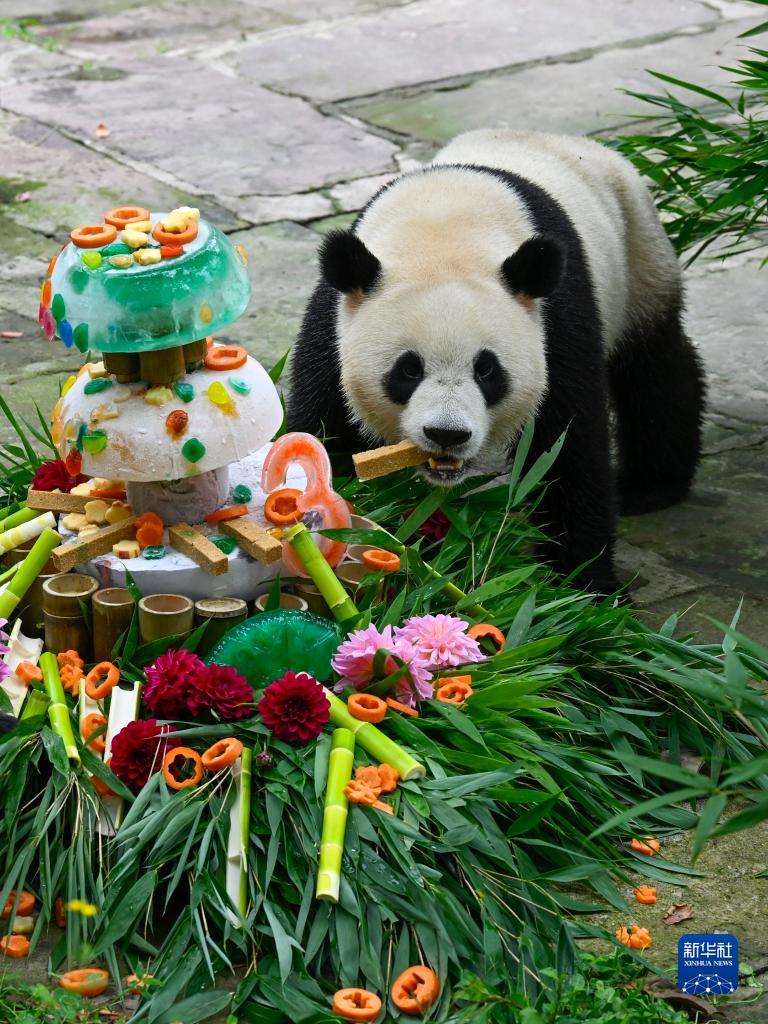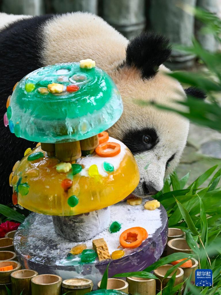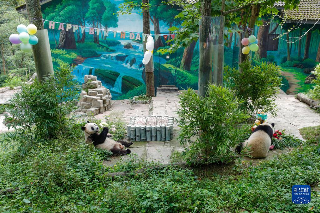 8月3日,在中國大熊貓保護研究中心雅安基地慶祝活動中,大熊貓“雅雅”“安安”在享用美食,吸引遊客駐足觀看。