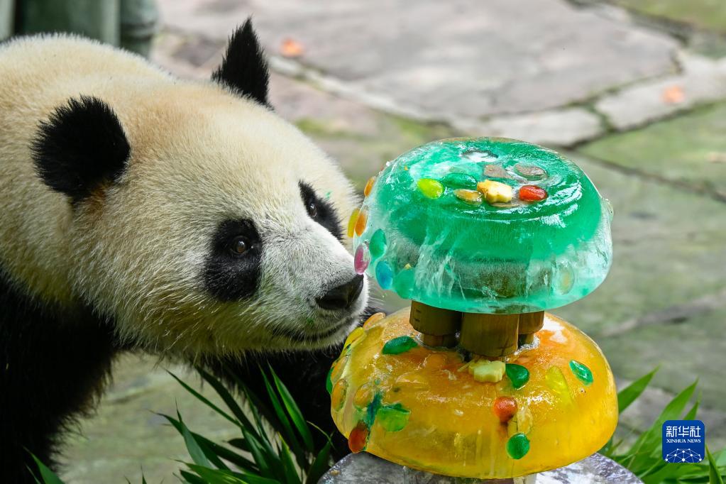 8月3日,在中國大熊貓保護研究中心雅安基地,大熊貓“雅雅”享用美食。