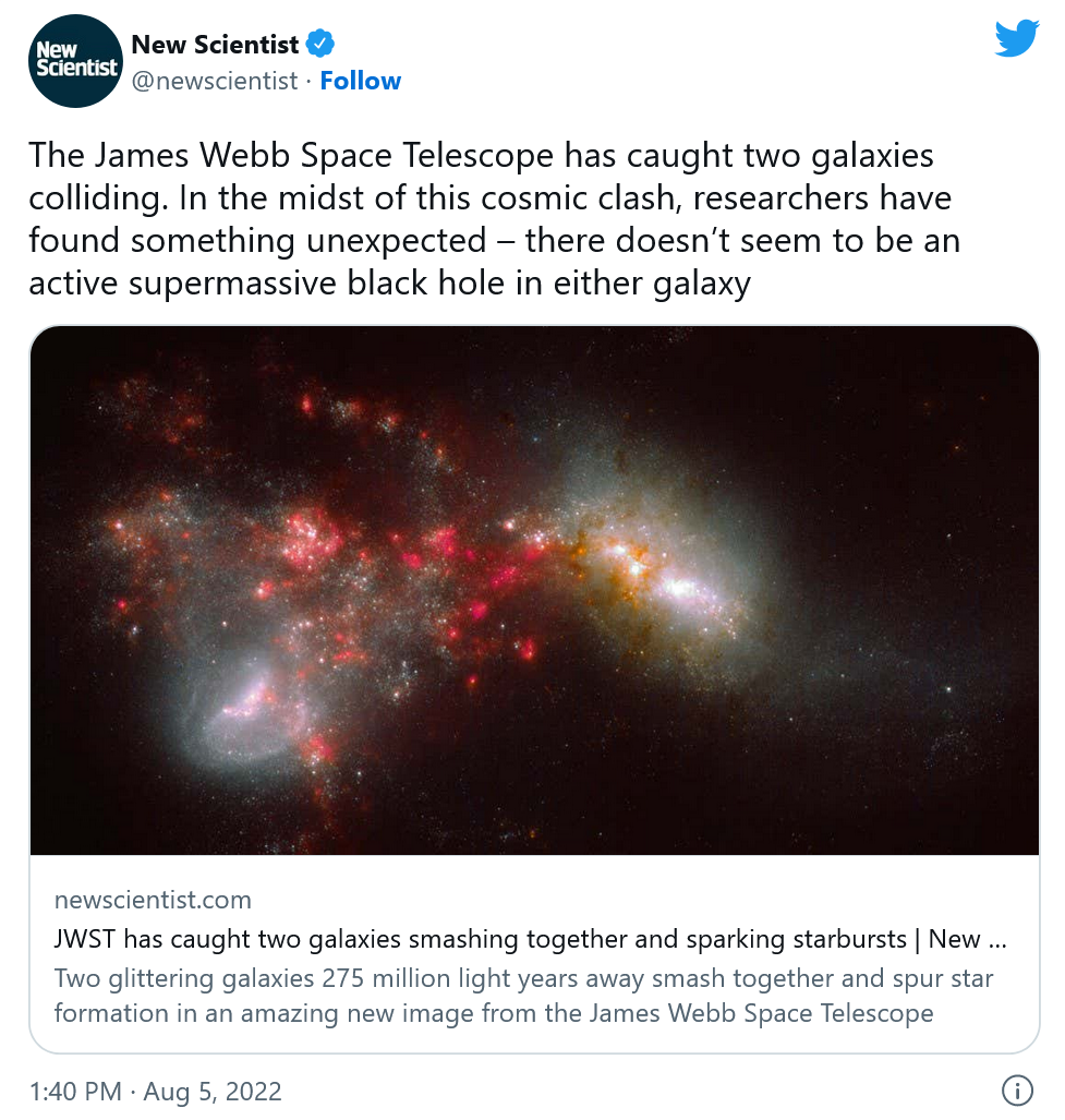 之後,碰撞通常會引起巨大的衝擊波從而穿過碰撞的星系。然而當研究人員開始分析這兩個砸在一起的星系時,他們發現這兩個星系似乎都沒有一個活躍的黑洞。該圖像可以在上面《New Scientist》的推文中看到。
