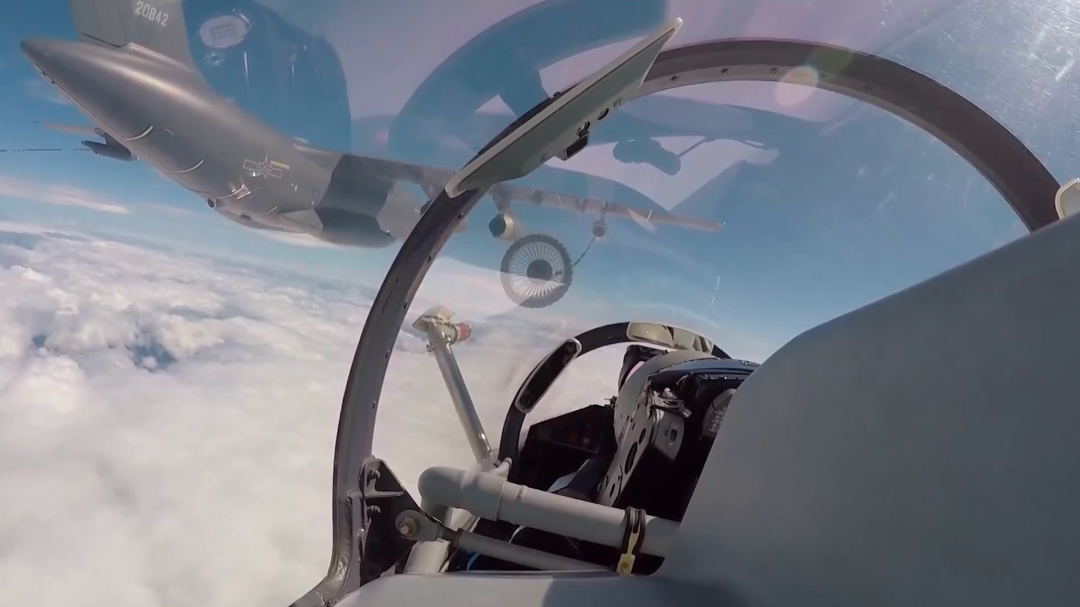 空軍飛行員侯弘和戰友執行抵近懾壓任務。他説:“目視距離俯瞰祖國寶島海岸線和中央山脈,作為軍人的使命感和榮譽感油然而生,維護祖國領土完整的決心更加堅定!”