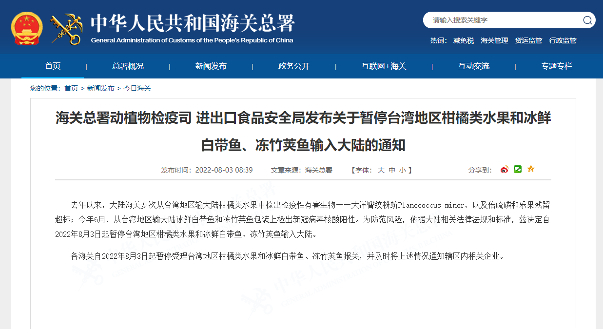 8月3日,大陸有關部門根據有關進出口方面的規定,以及食品安全要求和標準,對從台灣地區輸往大陸的葡萄柚、檸檬、橙等柑橘類水果和冰鮮白帶魚、凍竹莢魚採取暫停輸入措施。同時,大陸決定暫停天然砂對台出口。