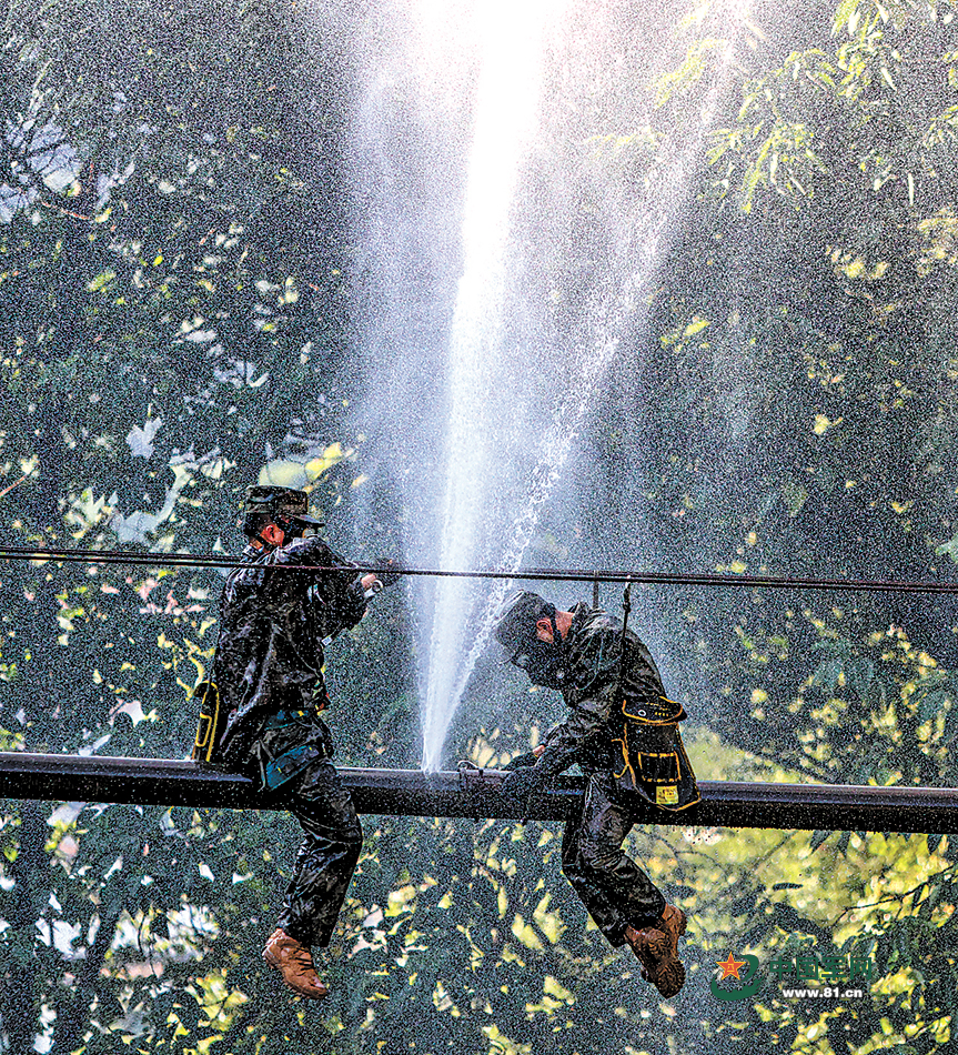 此時,油料噴湧已達3米多高,情況十分危急。搶修員戴的防毒面具使其視野受限,高空行走時每一步都驚心動魄。越接近受損點,腳下管線搖晃得越厲害,更是對搶修員的技能和心理帶來莫大考驗。他們安全到達作業點後,快速行動,短短4分鐘便完成堵塞漏點、拆換部件等工作,成功處置險情。官兵重新開閥啓泵,油料管線恢復暢通,“油龍”穿山越嶺挺進演訓場。