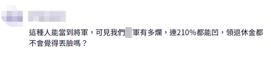 有網友説,這種人能當到將軍,可見台軍有多爛,連210%都能拗,領退休金都不會覺得丟臉嗎?↓