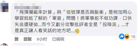 對於於北辰16日開嗆台“陸軍司令部”,併發誓從今開始會盡全力來監督台軍,絕不留情,有島內網友留言附和。不過,也有部分島內網友認為,導彈攔截率與信號彈是否具有脈衝功能是稍加用心學習就能瞭解到的,於北辰事前不做功課,口快失言還硬拗……而今又攻擊批評者全是“投降派”,這才是真正讓人看笑話的地方。↓