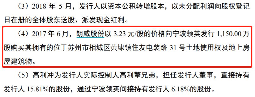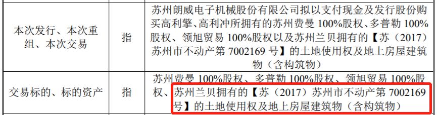 不僅如此,在朗威股份新三板掛牌期間,曾於2017年10月發佈《支付現金及發行股份購買資產暨重大資產重組報告書》,除以支付現金方式購買高利擎、高利衝所持有的蘇州領旭國際貿易有限公司、蘇州費曼電纜有限公司、寧波多普勒通訊有限公司100%的股權之外,還以3.23元/股價格向交易對手蘇州蘭貝信息科技有限公司發行1150萬股購買其擁有的位於蘇州市相城區黃埭鎮住友電裝路31號土地使用權及地上房屋建築物(含構築物) 【蘇(2017)蘇州市不動產第 7002169 號】,土地面積24604.3㎡/房屋、建築面積25881.21㎡。