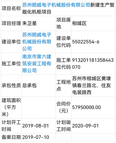 但據《蘇州朗威電子機械股份有限公司新建生產智能化機櫃項目》總承包招標信息,當時是由南京市第六建築安裝工程有限公司總承包的該項目,總承包金額僅為5795萬元,大大低於招股書披露的該項目預計建築工程費8803.27萬元的預算。
