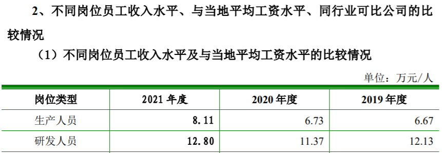 此外,根據招股書披露,朗威股份在2019年到2021年的員工總數分別為815人、1361 人和1390人,持續增加。但與此同時,《審核問詢函的回覆》中披露同期生產人員收入分別為6.67萬元/人、6.73萬元/人和8.11萬元/人,同期結轉的直接人工成本則分別為8818.41萬元、8797.34萬元和9987.97萬元。從中能夠看出,在2020年公司的直接人工成本,在生產人員收入小幅增長的背景下不增反降,這意味着公司的生產人員人數在2020年出現了減少;而同年公司的員工總數卻從815人增加到1361 人,產品產量也顯著增長,這並不符合正常的財務邏輯。