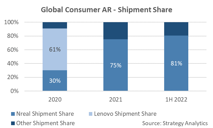 其中,報告中特別提到,AR領域的創業企業Nreal在這一領域處於早期領先地位,其出貨量在2021年的市場份額達到75%, 2022年上半年升至81%。