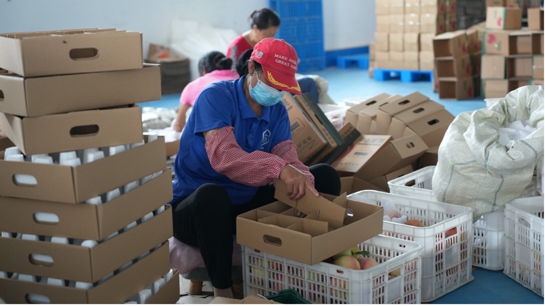 高春霞今年57歲,在合作社倉庫打包分揀已經四年了。“我家有一個不到兩畝地的大棚,每年5月,大棚裏的桃就賣完了,我就來這邊兼職,選果和裝箱,挑出去壞果,把桃按照大小分出等級來,對應裝箱。”