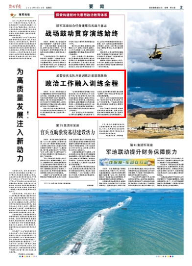 政治工作融入訓練全程,有效激發官兵練兵備戰熱情。近期,該支隊組織軍事訓練摸底考核,多個重難點課目總體成績較以往均有明顯提升。