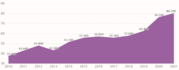 截至2000年,加納政府已陷入嚴重的財政困境。之後,該國加入了國際貨幣基金組織和世界銀行針對重債國家提出的倡議。由此,勾銷了該國近40億美元外債中的大部分債務。2006年,重債國家倡議結束,加納的全部政府債務已達到7.8億美元,佔國內生產總值的25%。從那時起,該國債務存量增加了7000%,達到540億美元,佔國內生產總值的78%。加納的當前債務佔國內生產總值的比例為78%,而發展中國家的平均債務佔比為60%。2006 年到 2021 年間加納政府債務佔國內生產總值的百分比,如圖所示: