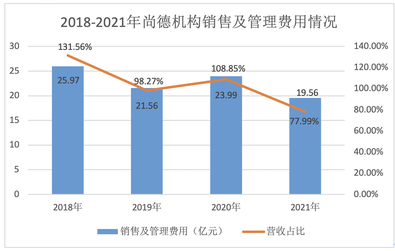 反映在財報上,2018年至2021年,尚德機構的銷售和管理費用合計分別為25.97億元、21.56億元、23.99億元和19.56億元,佔營收比例分別為131.56%、98.27%、108.85%和77.99%,整體下降趨勢明顯,費用優化效果顯著。