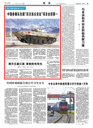 解放軍報庫爾勒8月21日電 記者程安琪、通訊員李珏宏報道:今天,“國際軍事比賽-2022”“蘇沃洛夫突擊”項目接力賽在中國庫爾勒賽區舉行。經過激烈角逐,中國參賽隊獲第一名,白俄羅斯、俄羅斯參賽隊分獲第二名和第三名。至此,“蘇沃洛夫突擊”項目比賽全部結束,中國參賽隊包攬單車賽和接力賽第一名。