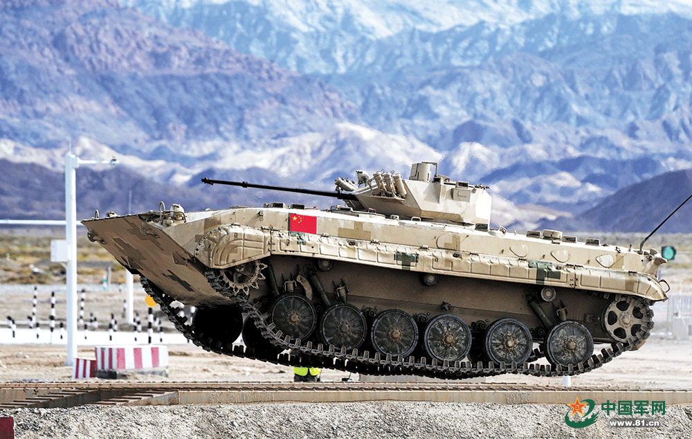 接力賽中,中國參賽隊員駕駛步戰車穿越障礙。張永進攝