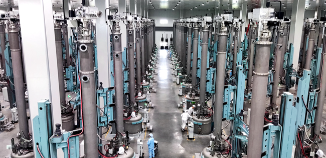 在協鑫科技的單晶硅生產車間內,矗立着308座單晶硅生長爐,據瞭解,該公司位於徐州的FBR顆粒硅產能已達6萬噸。