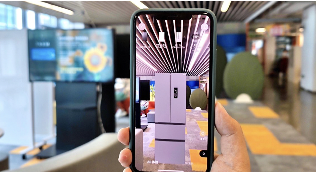 以選購冰箱為例,消費者可以通過手機屏幕把冰箱以3D投影的形式“擺放”在家裏任意位置,AR投影的商品可以調整與實物1:1的比例,查看空間尺寸大小,及擺放在家中的實際效果,方便網購家電時“所見即所得” 。