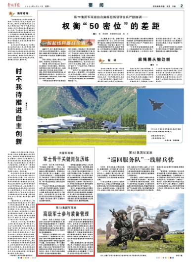 在該旅裝甲車庫,剛擔任站長的一級軍士長湯旺成忙着整理新裝備資料。雖然參與車庫管理時間不長,但他已熟練車輛快速定位、器材請領、故障判斷等工作。在車庫操作車間,技師楊玉振在二級軍士長雷鵬指導下,對某新型通信指揮車進行裝備性能測試。修理一連連長楊偉説,高級軍士技能基礎紮實,讓他們參與裝備管理有助於快速形成戰鬥力。