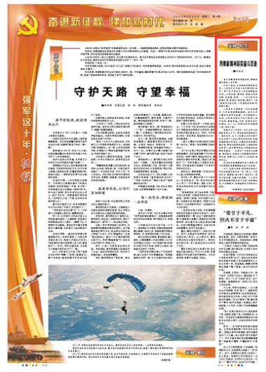 對軍人來説,無私奉獻是鮮亮的本色。人民軍隊95年奮鬥的光輝歷程,就是一部人民子弟兵為人民赤誠奉獻的史詩。從張思德、董存瑞、黃繼光到李向羣、林俊德、張超……人民子弟兵甘願拋頭顱、灑熱血、赴危難,譜寫了一曲“祖國安寧我光榮,人民富裕我幸福”的奉獻之歌。