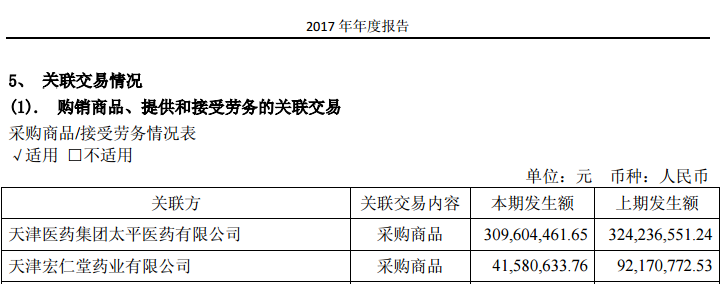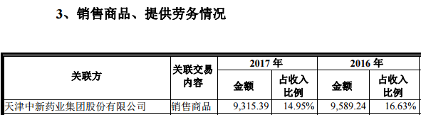此外,中新藥業還與宏仁堂之間存在很大的關聯交易。根據津同仁堂披露,在2016年向中新藥業銷售金額為9589.24萬元,這與中新藥業在其2017年報中披露的、與宏仁堂之間發生的關聯採購金額9217.08萬元相差並不大;但是兩家公司針對2017年購銷數據確認,卻存在巨大差異,津同仁堂披露的銷售金額高達9315.39萬元,而中新藥業披露的採購金額則只有4158.06萬元,相差達五千萬元以上。