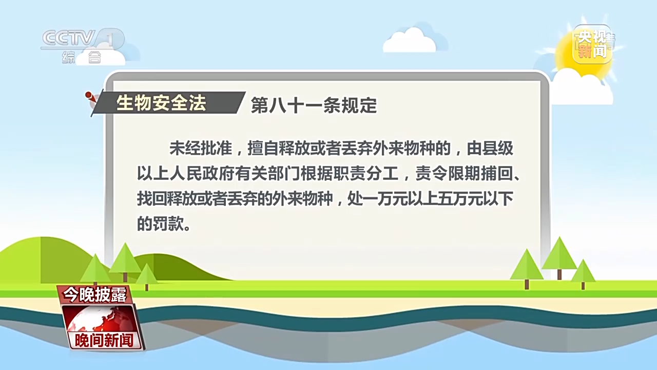 中國農業大學教授 農業與農村法制研究中心主任 任大鵬:“《生物安全法》第六十條第三款明確規定,任何單位和個人未經批准,不得擅自引進、釋放或者丟棄外來物種。”