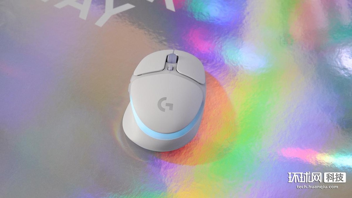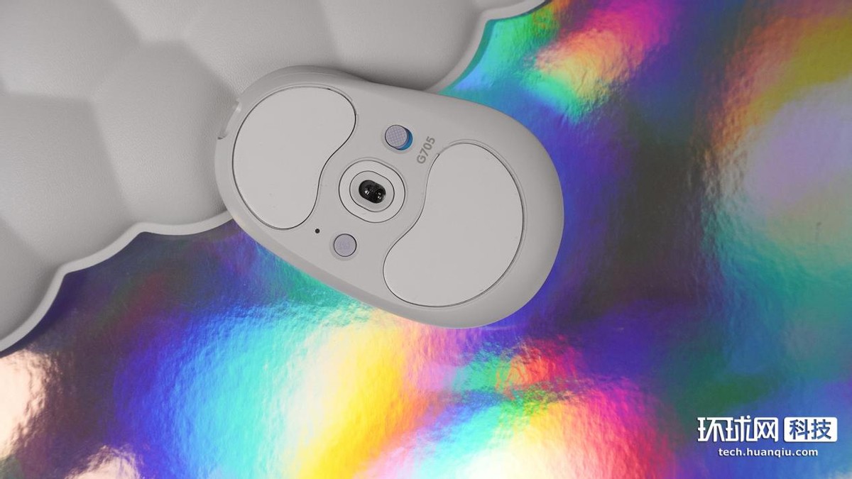 G705無線遊戲鼠標除了中鍵、DPI循環鍵、前進與後退鍵是低飽和度的藕荷色外,整體也呈白色。正面下方是羅技的銀色logo,logo的邊緣處圍繞着RGB燈帶。
